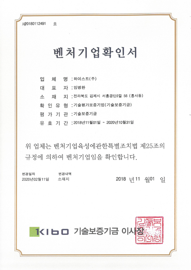 인증서 | 벤처기업확인서